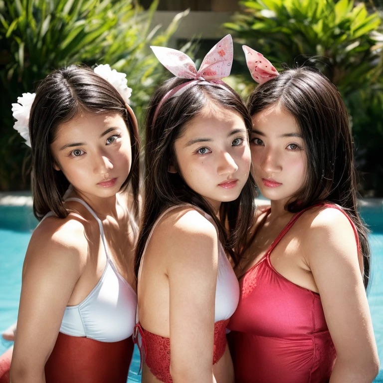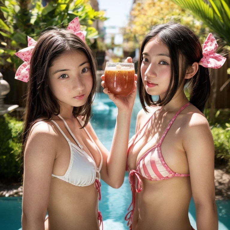 夏の午後、ホテルのプールサイドは柔らかな日差しに包まれていた。青い水面がキラキラと輝き、軽やかな風がヤシの木の葉を揺らしていた。プールサイドのデッキチェアに横たわるふたりの紗綾は、冷たいドリンクを手にしてリラックスしていた。